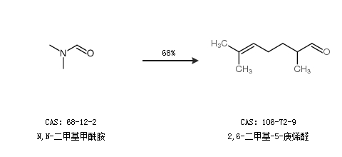 2.通過N,N-二甲基甲酰胺合成2,6-二甲基-5-庚烯醛,收率約68%;