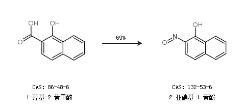 1.通過1-羥基-2-萘甲酸合成2-亞硝基-1-萘酚,收率約69%;