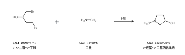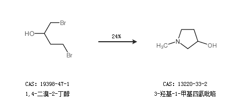 1.通過1,4-二溴-2-丁醇合成3-羥基-1-甲基四氫吡咯,收率約24%;