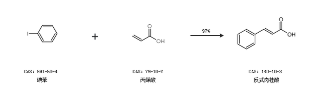 2.通過(guò)碘苯和丙烯酸合成反式肉桂酸,收率約97%;