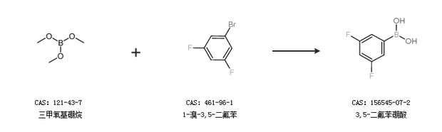 1.通過(guò)三甲氧基硼烷和1-溴-3,5-二氟苯合成3,5-二氟苯硼酸