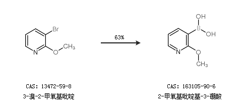 2.通過3-溴-2-甲氧基吡啶合成2-甲氧基吡啶基-3-硼酸,收率約63%;