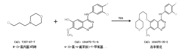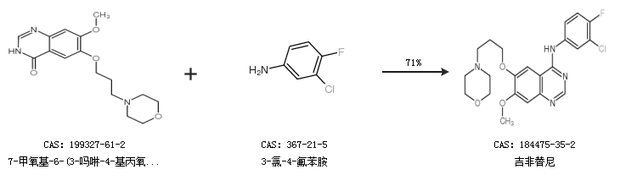 1.通過(guò)7-甲氧基-6-(3-嗎啉-4-基丙氧基)喹唑啉-4(3H)-酮和3-氯-4-氟苯胺合成吉非替尼,收率約71%;