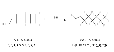 1.通過3,3,4,4,5,5,6,6,7,7,8,8,8-十三氟-1-辛醇合成1-碘-1H,1H,2H,2H-全氟辛烷,收率約89%;