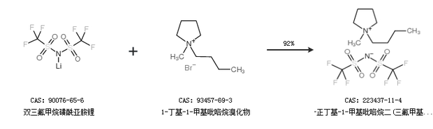 2.通過1-丁基-1-甲基吡咯烷碘化物和雙三氟甲烷磺酰亞胺鋰合成1-正丁基-1-甲基吡咯烷二(三氟甲基磺酰)酰亞胺,收率約86%;