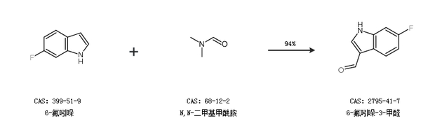 1.通過6-氟吲哚和N,N-二甲基甲酰胺合成6-氟吲哚-3-甲醛,收率約94%;