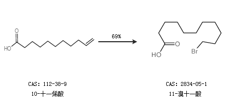 1.通過10-十一烯酸合成11-溴十一酸,收率約69%;