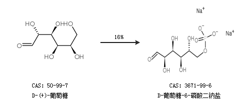 1.通過D-(+)-葡萄糖合成D-葡萄糖-6-磷酸二鈉鹽,收率約16%;