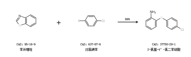 1.通過(guò)苯并噻唑和對(duì)氯碘苯合成2-氨基-4’-氯二苯硫醚,收率約99%;