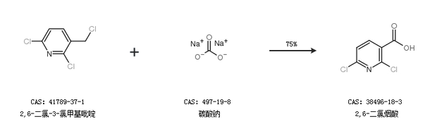1.通過(guò)2,6-二氯-3-氯甲基吡啶和碳酸鈉合成2,6-二氯煙酸,收率約75%;