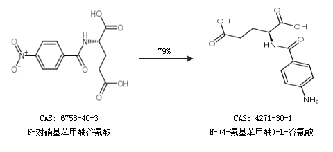 1.通過(guò)N-對(duì)硝基苯甲酰谷氨酸合成N-(4-氨基苯甲酰)-L-谷氨酸,收率約79%;