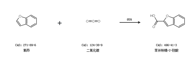 1.通過氧茚和二氧化碳合成苯并呋喃-2-羧酸,收率約85%;