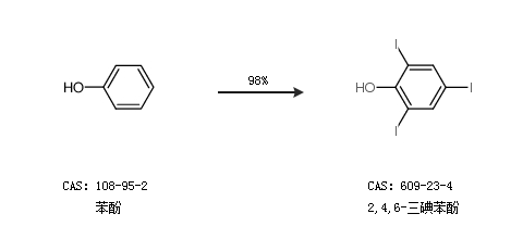 1.通過苯酚合成2,4,6-三碘苯酚,收率約98%;