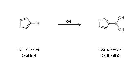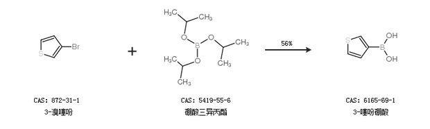 用于合成中間體。3-噻吩硼酸分子中引入了噻吩基團(tuán)成為了非常有用的試劑。在Suzuki-Miyaura偶聯(lián)反應(yīng)中,加入鈀催化劑,2-噻吩基硼酸與5-溴嘧啶衍生物反應(yīng)得到73%的5-(2-噻吩) 嘧啶衍生物