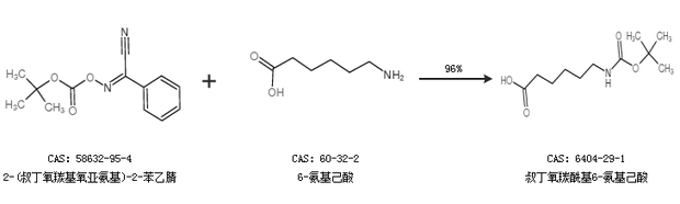 2.通過(guò)2-(叔丁氧羰基氧亞氨基)-2-苯乙腈和6-氨基己酸合成叔丁氧羰?;?-氨基己酸,收率約96%;