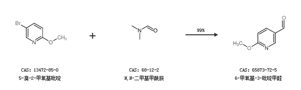 1.通過(guò)5-溴-2-甲氧基吡啶和N,N-二甲基甲酰胺合成6-甲氧基-3-吡啶甲醛,收率約99%;