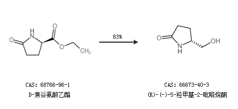 2.通過D-焦谷氨酸乙酯合成(R)-(-)-5-羥甲基-2-吡咯烷酮,收率約83%;