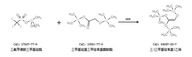 1.通過三氟甲磺酸三甲基硅酯和三甲基硅基三甲硅氧基醋酸酯合成三(三甲基硅氧基)乙烯,收率約88%;