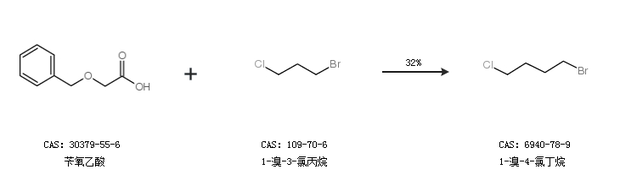 1.通過芐氧乙酸和1-溴-3-氯丙烷合成1-溴-4-氯丁烷,收率約32%;