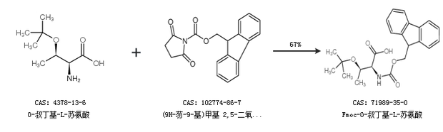 1.通過O-叔丁基-L-蘇氨酸和(9H-芴-9-基)甲基 2,5-二氧代吡咯烷-1-羧酸合成Fmoc-O-叔丁基-L-蘇氨酸,收率約67%;