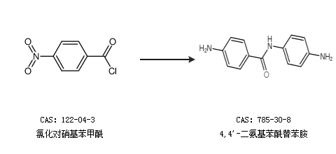 1.通過(guò)氯化對(duì)硝基苯甲酰合成4,4''-二氨基苯酰替苯胺