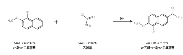 2.通過(guò)1-溴-2-甲氧基萘和乙酰氯合成2-乙酰-5-溴-6-甲氧基萘,收率約96%;