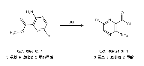 1.通過(guò)3-氨基-6-溴吡嗪-2-甲酸甲酯合成3-氨基-6-溴吡嗪-2-甲酸,收率約10%;
