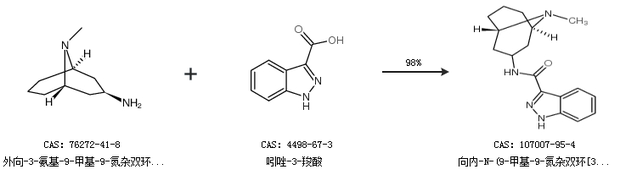 1.通過(guò)外向-3-氨基-9-甲基-9-氮雜雙環(huán)[3,3,1]壬烷和吲唑-3-羧酸合成向內(nèi)-N-(9-甲基-9-氮雜雙環(huán)[3.3.1]壬烷-3基)-1H-吲唑-3-甲酰胺,收率約98%;