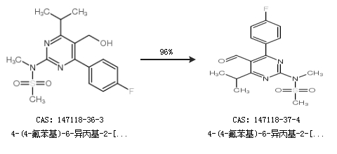 2.通過4-(4-氟苯基)-6-異丙基-2-[(N-甲基-N-甲磺酰)氨基]嘧啶-5-甲醇合成4-(4-氟苯基)-6-異丙基-2-[(N-甲基-N-甲磺酰)氨基]嘧啶-5-甲醛,收率約96%;