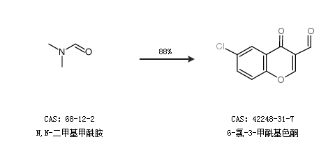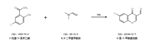 1.通過2-羥基-5-氯苯乙酮和N,N-二甲基甲酰胺合成6-氯-3-甲酰基色酮,收率約79%;