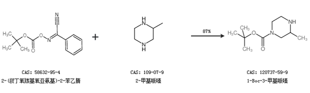 2.通過2-(叔丁氧羰基氧亞氨基)-2-苯乙腈和2-甲基哌嗪合成1-Boc-3-甲基哌嗪,收率約87%;