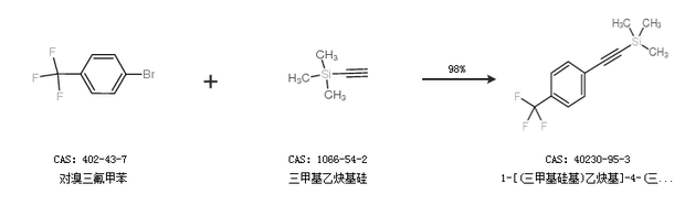 1.通過對溴三氟甲苯和三甲基乙炔基硅合成1-[(三甲基硅基)乙炔基]-4-(三氟甲基)苯,收率約98%;