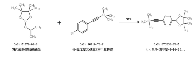 2.通過異丙醇頻哪醇硼酸酯和(4-溴苯基乙炔基)三甲基硅烷合成4,4,5,5-四甲基-2-[4-[(三甲基硅基)乙炔基]苯基]-1,3,2-二氧雜硼烷,收率約91%;