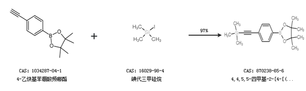 1.通過4-乙炔基苯硼酸頻哪酯和碘代三甲硅烷合成4,4,5,5-四甲基-2-[4-[(三甲基硅基)乙炔基]苯基]-1,3,2-二氧雜硼烷,收率約97%;