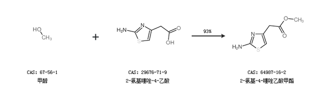 1.通過(guò)甲醇和2-氨基噻唑-4-乙酸合成2-氨基-4-噻唑乙酸甲酯,收率約93%;