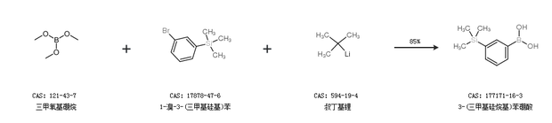 1.通過三甲氧基硼烷、1-溴-3-(三甲基硅基)苯和叔丁基鋰合成3-(三甲基硅烷基)苯硼酸,收率約85%;