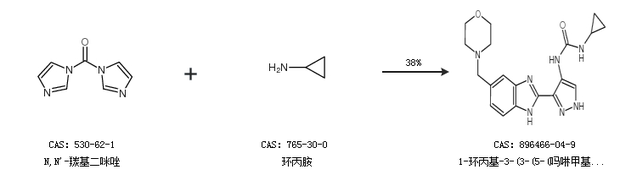 2.通過N,N''-羰基二咪唑和環(huán)丙胺合成1-環(huán)丙基-3-(3-(5-(嗎啉甲基)-1H-苯并[d]咪唑-2-基)-1H-吡唑-4-基)脲,收率約38%;