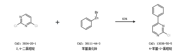 2.通過2,4-二氯嘧啶和苯基溴化鋅合成4-苯基-2-氯嘧啶,收率約63%;