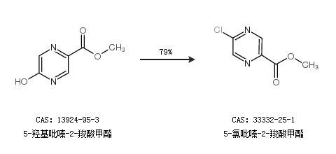 1.通過5-羥基吡嗪-2-羧酸甲酯合成5-氯吡嗪-2-羧酸甲酯,收率約79%;