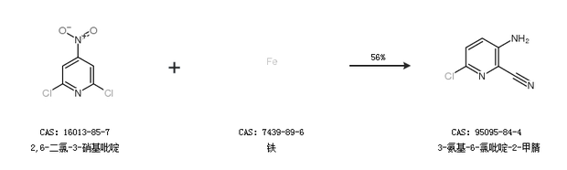2.通過2,6-二氯-3-硝基吡啶和鐵合成3-氨基-6-氯吡啶-2-甲腈,收率約56%;