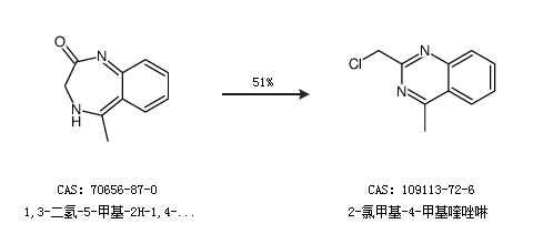 2.通過1,3-二氫-5-甲基-2H-1,4-苯并二氮雜革-2-酮合成2-氯甲基-4-甲基喹唑啉,收率約51%;