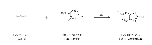 1.通過二硫化碳和2-碘-4-氟苯胺合成6-氟-2-巰基苯并噻唑,收率約86%;