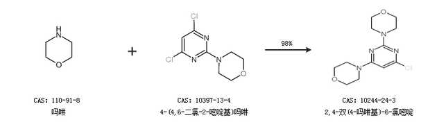2.通過嗎啉和4-(4,6-二氯-2-嘧啶基)嗎啉合成2,4-雙(4-嗎啉基)-6-氯嘧啶,收率約98%;