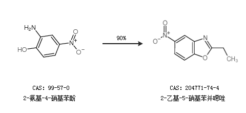 1.通過(guò)2-氨基-4-硝基苯酚合成2-乙基-5-硝基苯并噁唑,收率約90%;