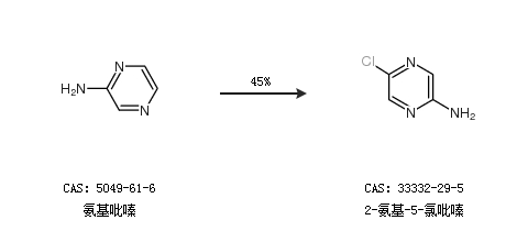 1.通過氨基吡嗪合成2-氨基-5-氯吡嗪,收率約45%;