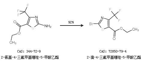 1.通過2-氨基-4-三氟甲基噻唑-5-甲酸乙酯合成2-溴-4-三氟甲基噻唑-5-甲酸乙酯,收率約92%;