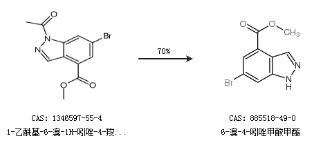 1.通過(guò)1-乙?;?6-溴-1H-吲唑-4-羧酸甲酯合成6-溴-4-吲唑甲酸甲酯,收率約70%;