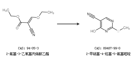 1.通過2-甲基-2-疏基硫酸脲和2-氰基-3-乙氧基丙烯酸乙酯合成2-甲硫基-4-羥基-5-氰基嘧啶,收率約63%;