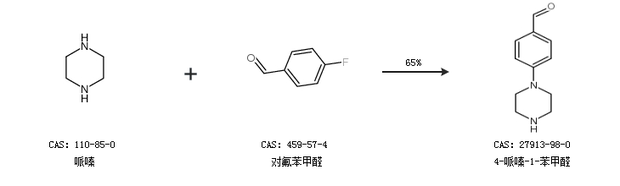 1.通過哌嗪和對(duì)氟苯甲醛合成4-哌嗪-1-苯甲醛,收率約65%;