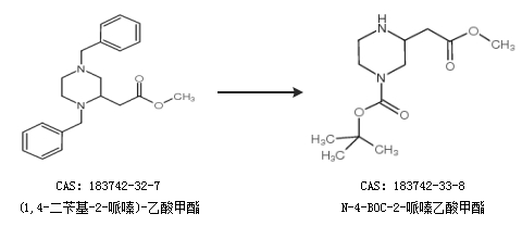 2.通過(guò)(1,4-二芐基-2-哌嗪)-乙酸甲酯合成N-4-BOC-2-哌嗪乙酸甲酯
